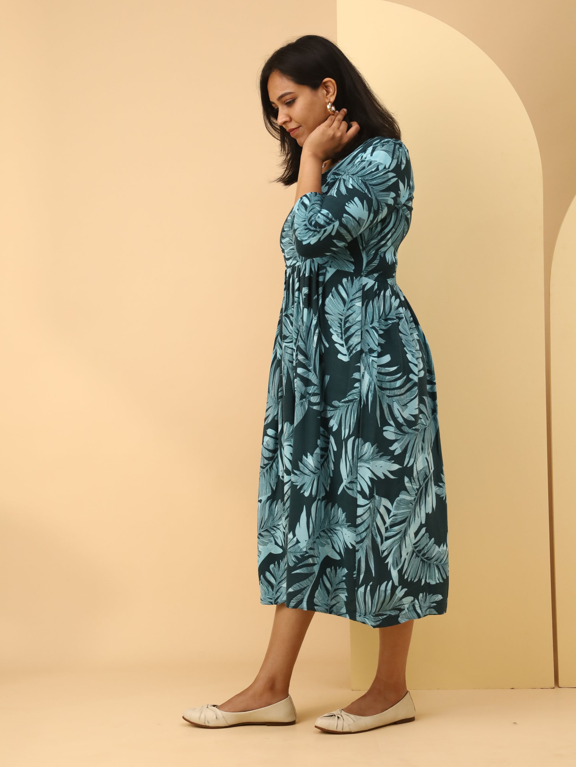 Expertly crafted and designed with a tropical leaf print and an empire waist, this maxi dress is perfect for any occasion. Its unique features provide both style and comfort, ensuring a perfect fit for any body type. Elevate your wardrobe with this versatile and stunning piece.